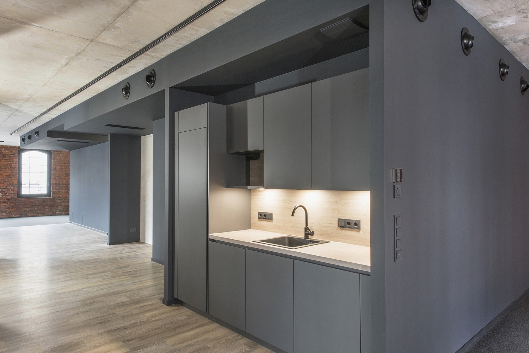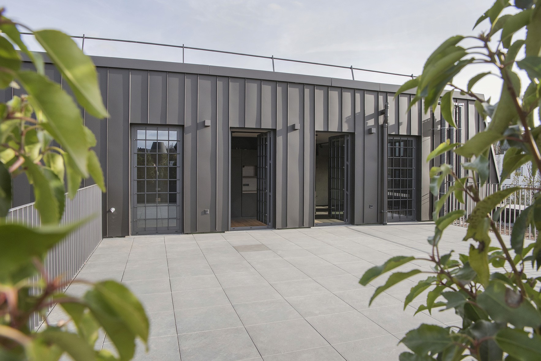 In den Obergeschossen befinden sich über einen Aufzug erschlossen vier variabel nutzbare Büroeinheiten, die sich offen und weitläufig jeweils über die gesamte Fläche des Alt- und Neubaus erstrecken und zudem sonnige Dachterrassen bieten. Sämtliche neuen tragenden Bauteile wie Wände und Stützen, bleiben in Sichtbetonqualität klar ablesbar, ebenso wie sich neue Trennwände der Nebenräume oder Abhangdecken der Technik konsequent in Anthrazitgrau von den roten Bestandswänden absetzen. Diese Kombination des Gegensätzlichen, bildet Innen wie Außen ein spannungsvolles Wechselspiel zwischen Alt und Neu.